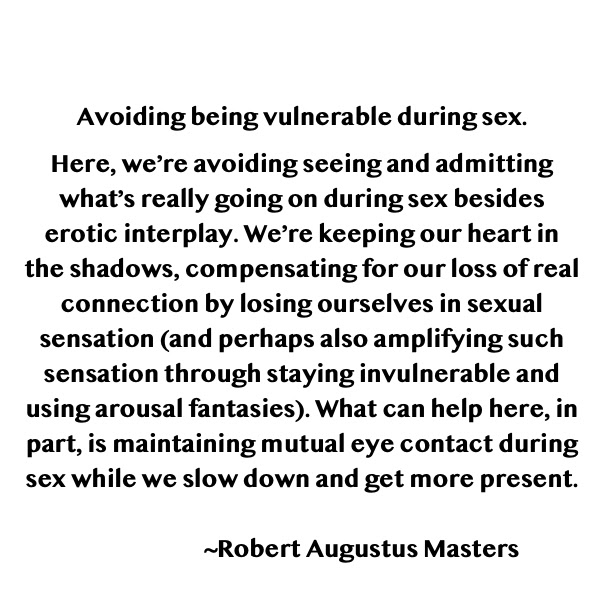 In his book, Bringing Your Shadow Out of the Dark: Breaking Free from the Hidden Forces That Drive You, Robert Augustus Masters expresses the need to change how we relate to sexual intimacy.